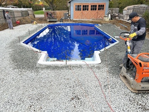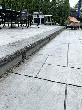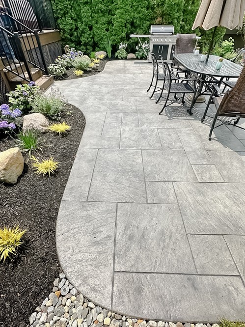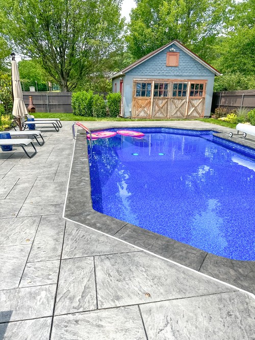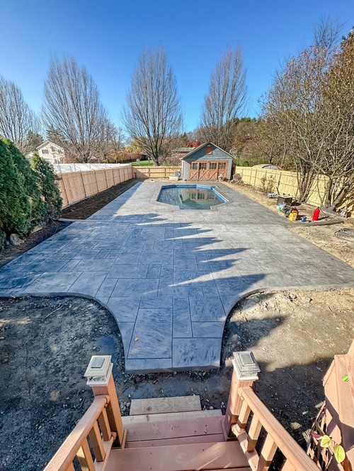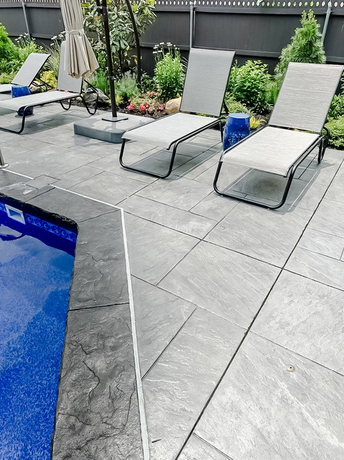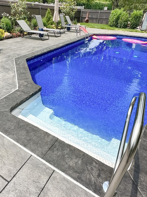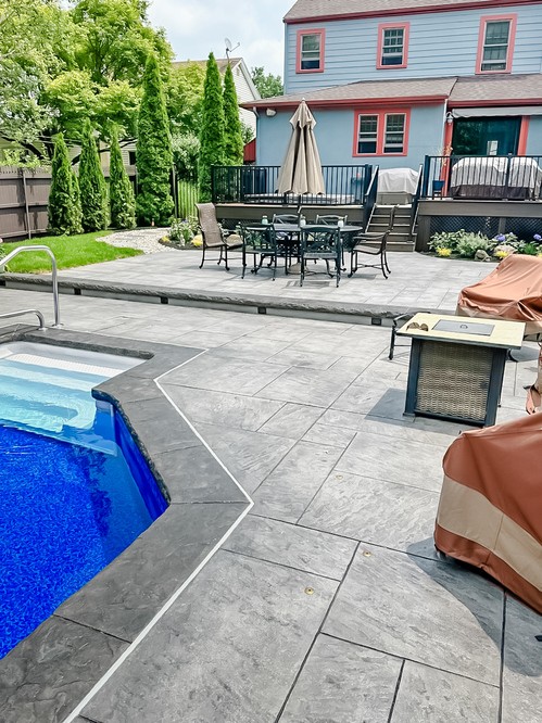 We elevated this backyard with a custom stamped concrete pool deck that mimics the look of Yorkstone, offering both durability and style. The design features custom stained pool coping, counter-level steps for added depth, and custom seamless covers for the sump pump and skimmer, tying everything together.
